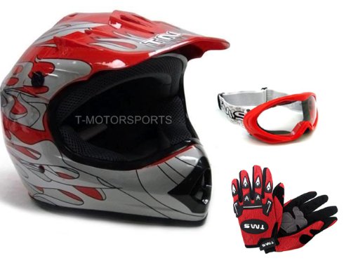Discount TMS Youth Red Flame Dirt Bike ATV Motocross Helmet with Goggles and Gloves (Medium) Sale